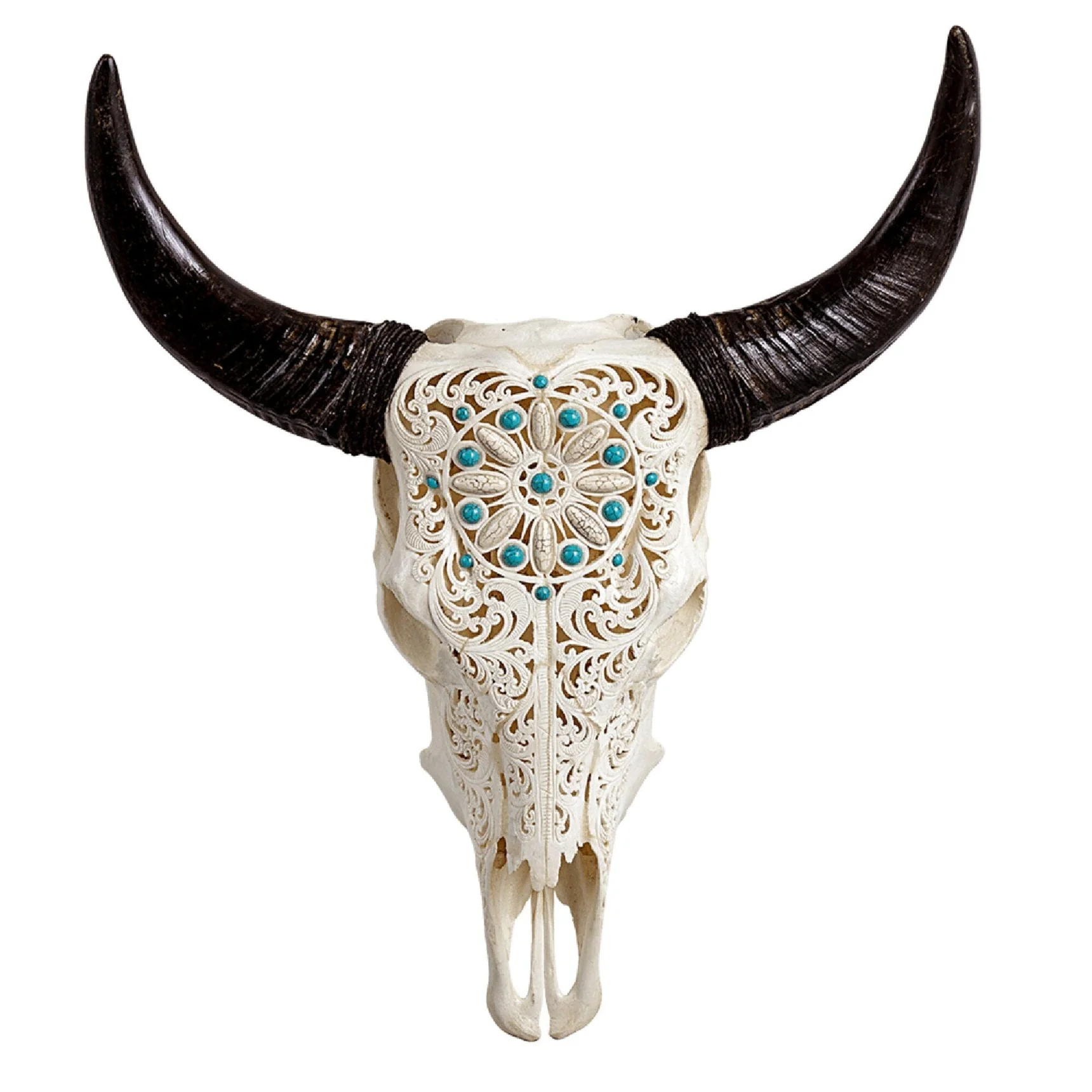Hand carved in Bali, this authentic Cow Skull features an intricate carved design created using traditional methods. Believed to have protective properties, carved skulls are used in Balinese homes to ward against negative energy. Coupled with Turquoise’s properties of serenity and wellbeing, this uniquely beautiful Cow Skull is perfect for displaying in spaces that need an aura of calm.
